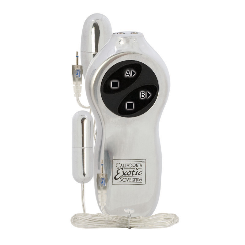 Sterling Collection Combo 5 is a powerful 7 function controller with 2 jacks. Independent controls. Safe and pure for body and pleasure. Made using phthalate free, non-toxic materials ABS plastic controller, ABS plastic with silver plating bullet vibrators. Vibrating sex toy requires 4 AA batteries, not included. Do not leave batteries in the vibrator between uses. Controller measures 5 inches long by 2 inches wide. Standard bullet measures 2.2 inches long by 1 inch wide. Slimline bullet vibrator measures 2 inches long by .6 inch wide. Bulk weight: 4.6 ounces. Always clean before and after use. Category: For Women, Bullets, Beads & Balls, Bullets. Sterling Collection Combo 4 is a registered trademark for California Exotic Novelties. Sex toys and sexual wellness. New high resolution images added.